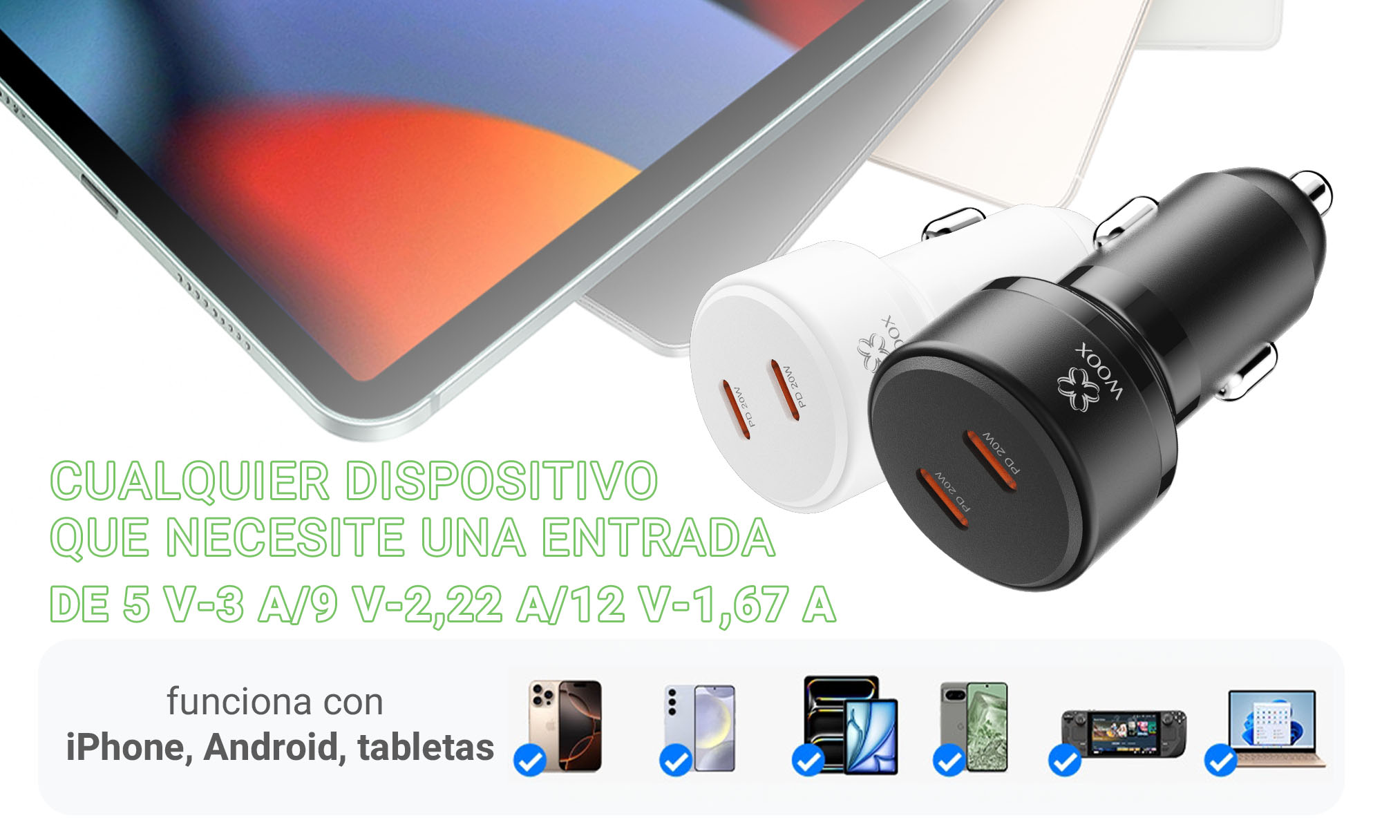 Puertos duales para carga simultánea de hasta 2 dispositivos