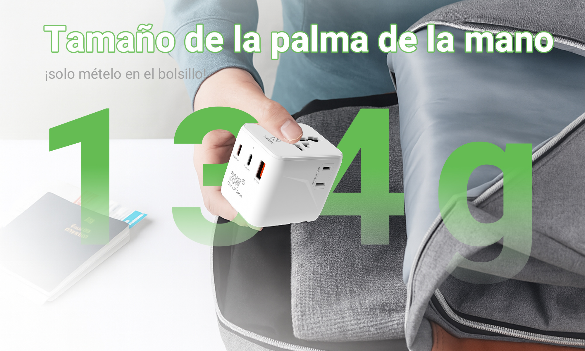 Carga rápida de 20 W con 2 puertos tipo C y 1 USB