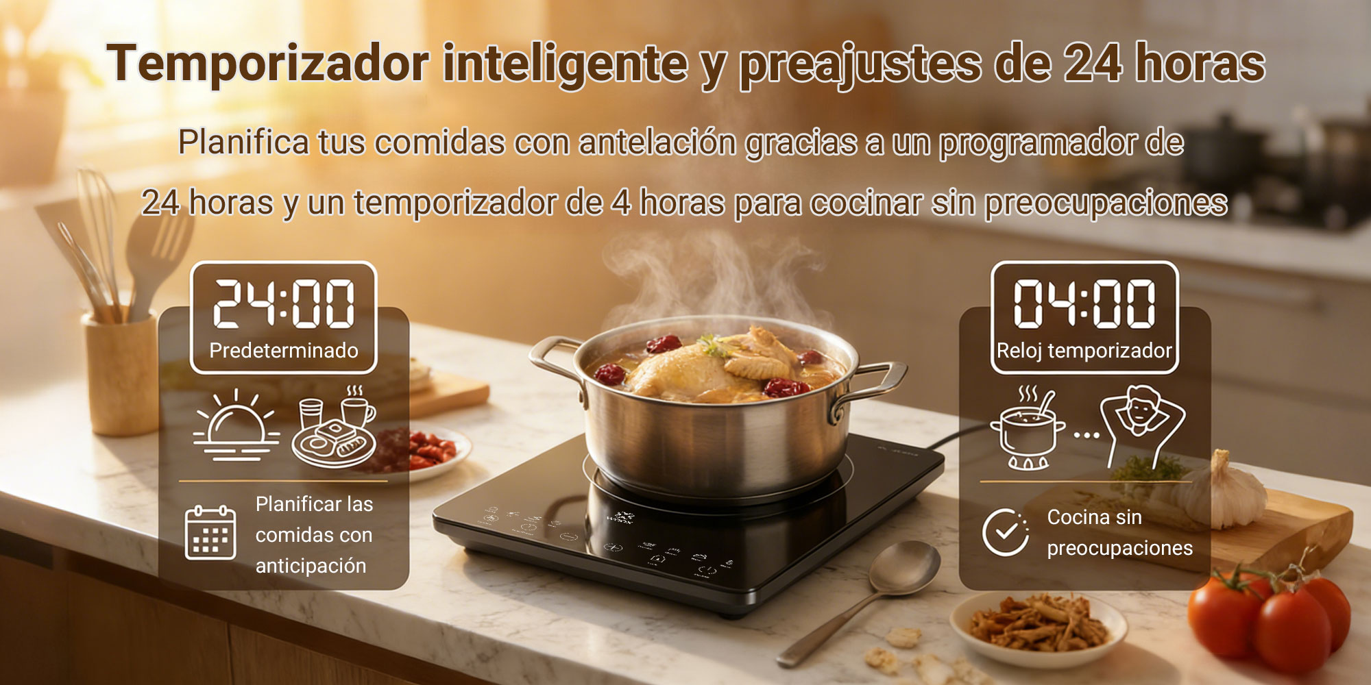 Programación de comidas con hasta 24 horas de antelación; temporizador de 4 horas.