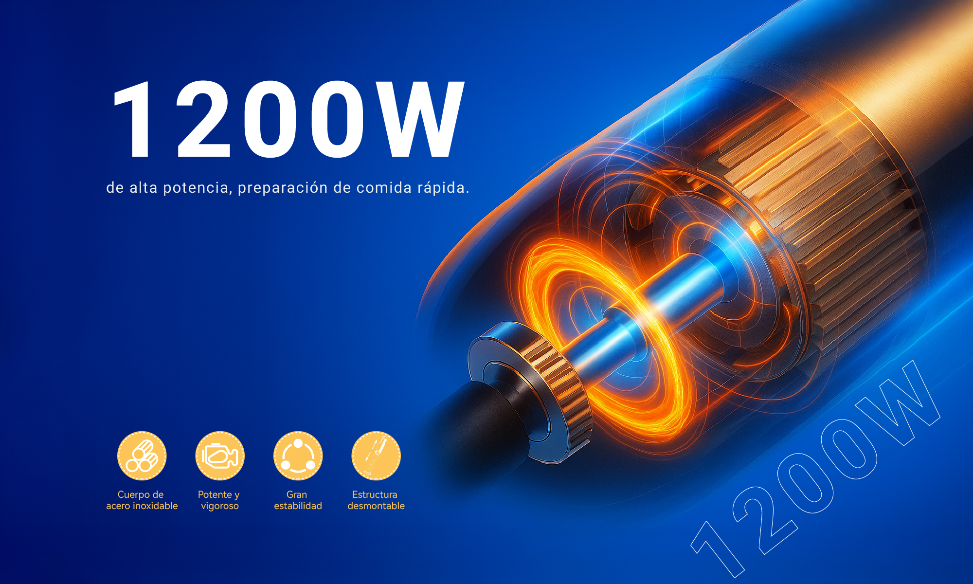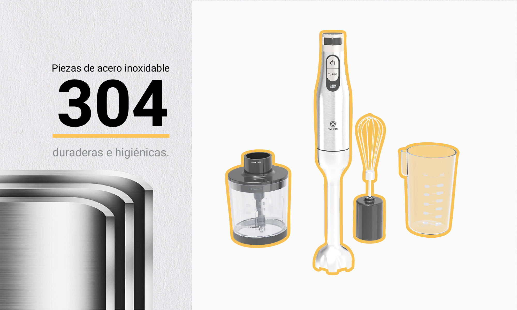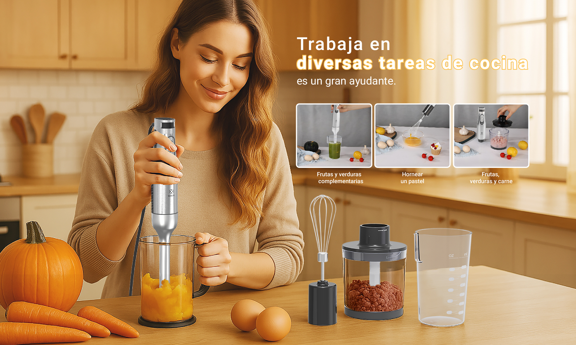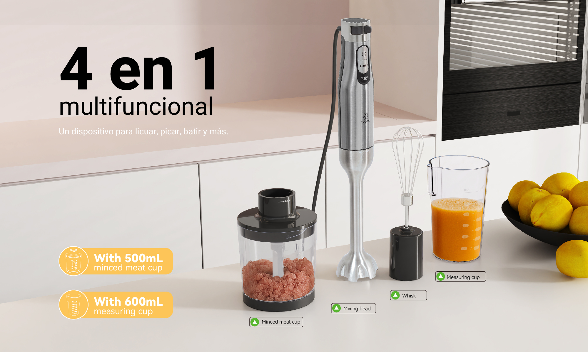 Batidora de mano 4 en 1 MX0205 de 1000 W. Incluye batidor, picadora de 500 ml y vaso de 600 ml.