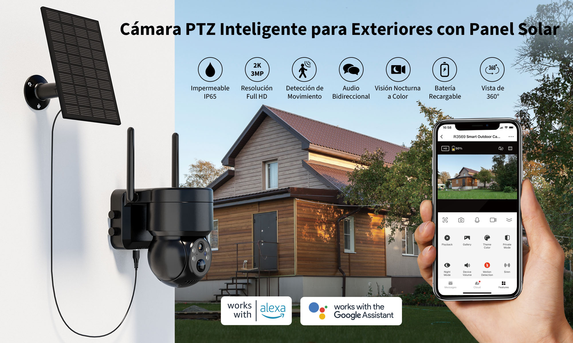 Kit de Seguridad PTZ al Aire Libre R3569 - Energía Solar+Batería, 2K/3MP HD, Rotación 265°/100°, Wi-Fi 2.4GHz