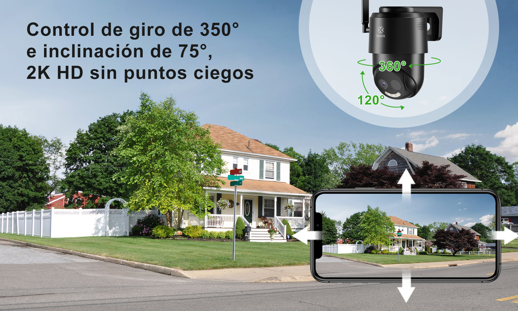 Rotación controlada por app, con ángulos de giro horizontal y vertical de hasta 350°/75°.