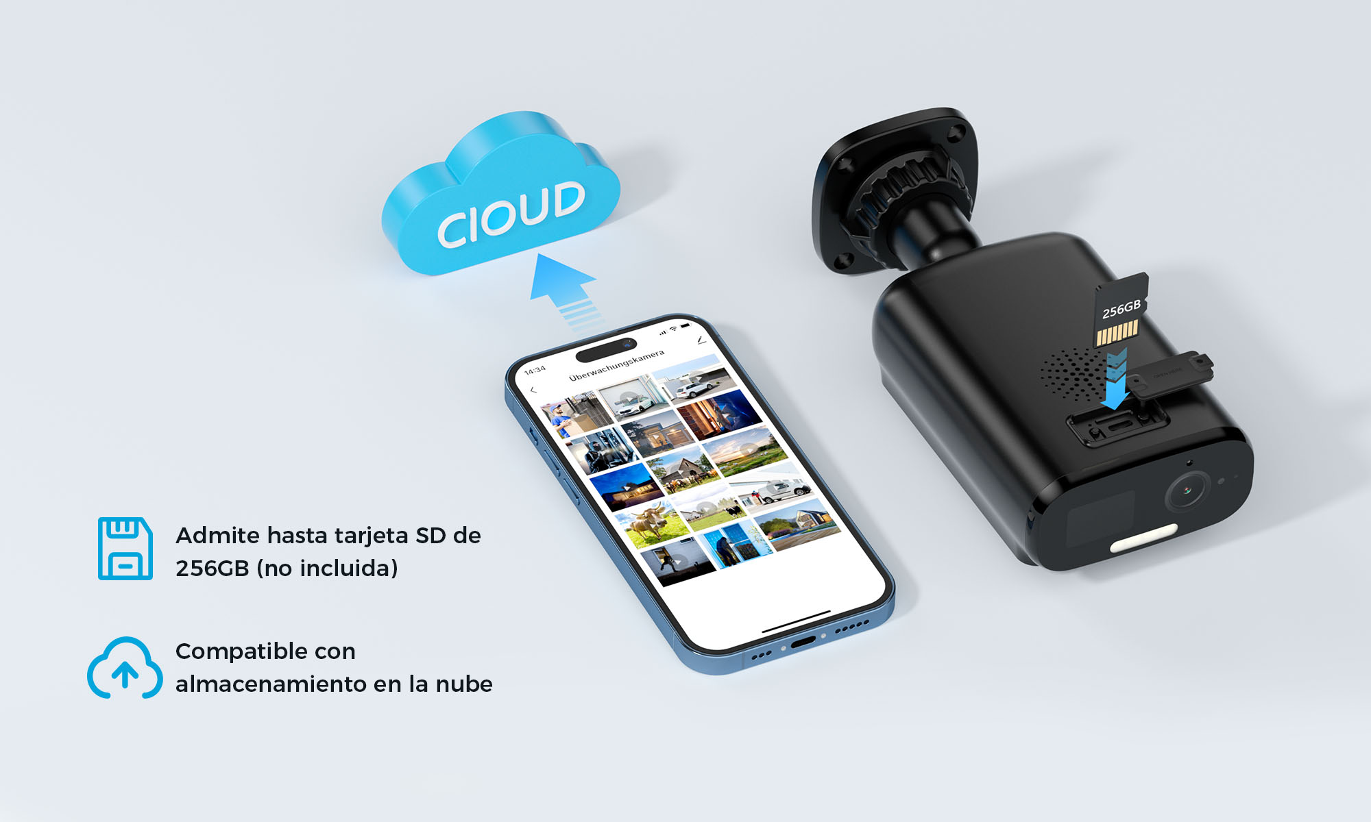 Admite grabación local en tarjetas SD de hasta 256 GB y una prueba gratuita de 7 días de almacenamiento en la nube.